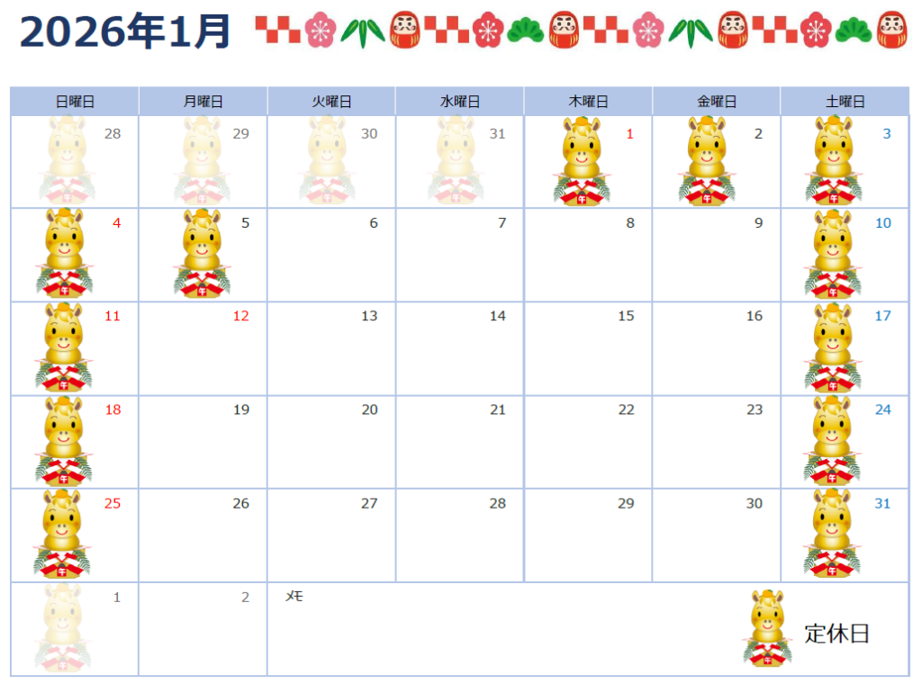 1月の定休日カレンダーとなります。