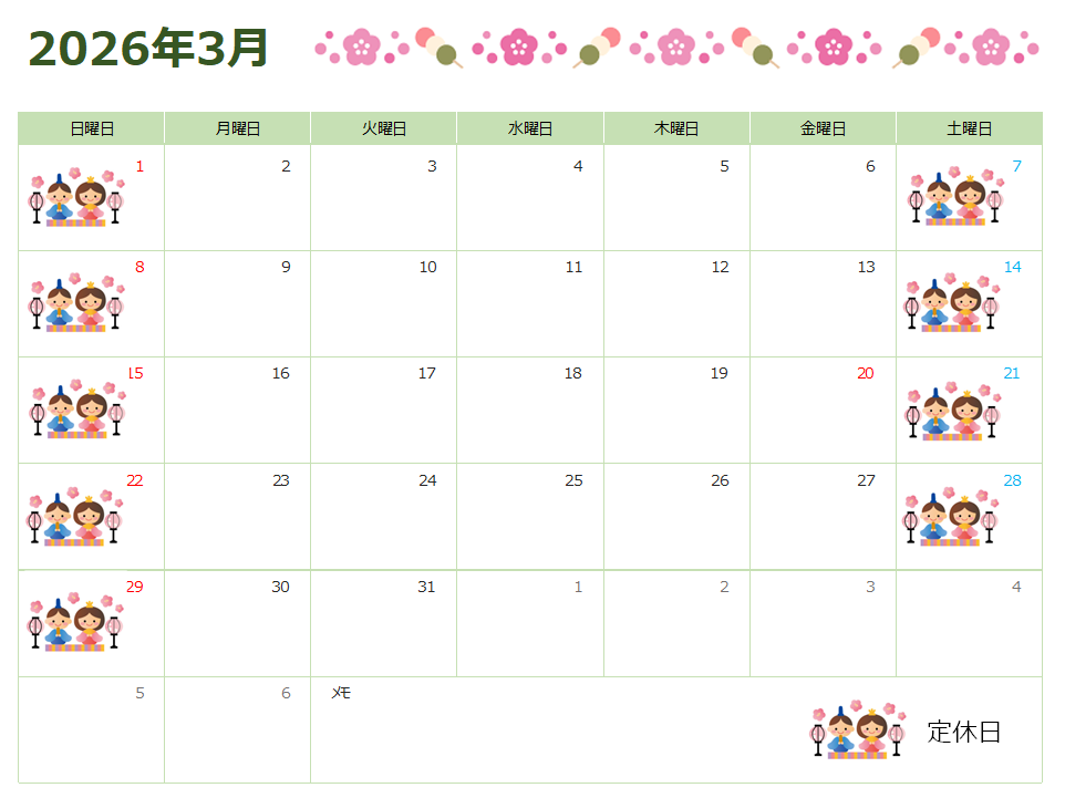 3月カレンダー 2026年3月1日 最終更新日時 : 2026年2月25日 和光工業(株) 3月の定休日カレンダーとなります。ご確認いただきますようお願いいたします。 お気軽にお問い合わせくださいTEL:048-871-7227受付時間:9:00~17:00(土・日・祝日除く)お問い合わせはこちら