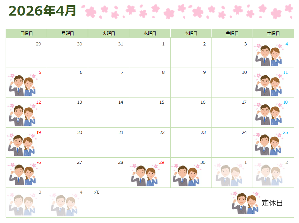 4月の定休日カレンダーとなります。
